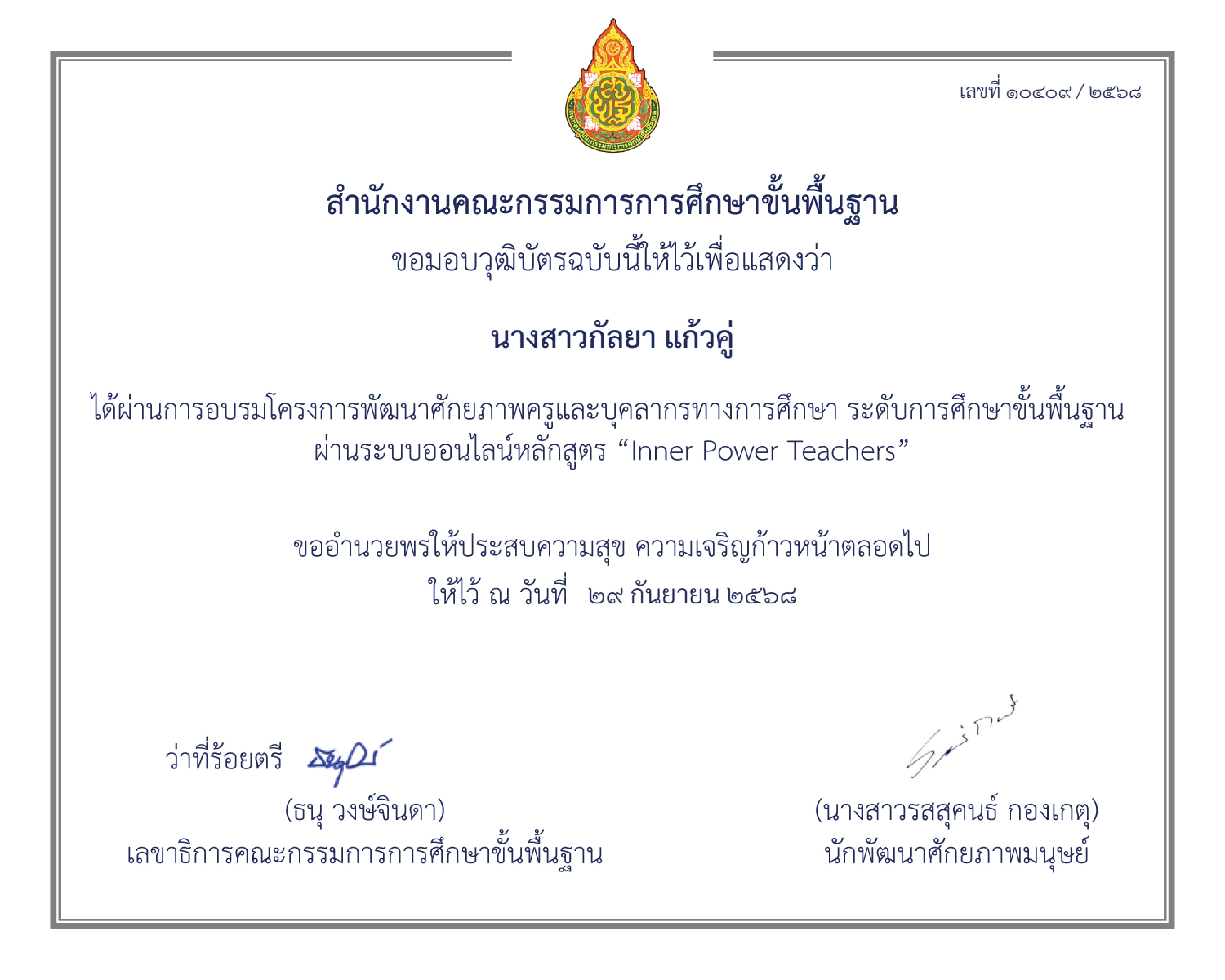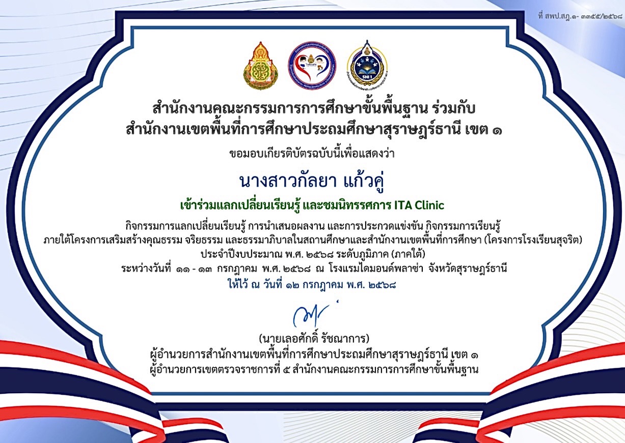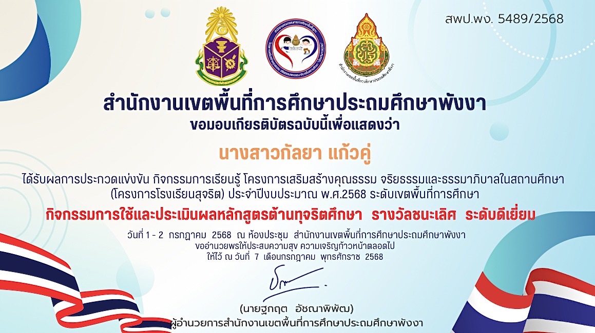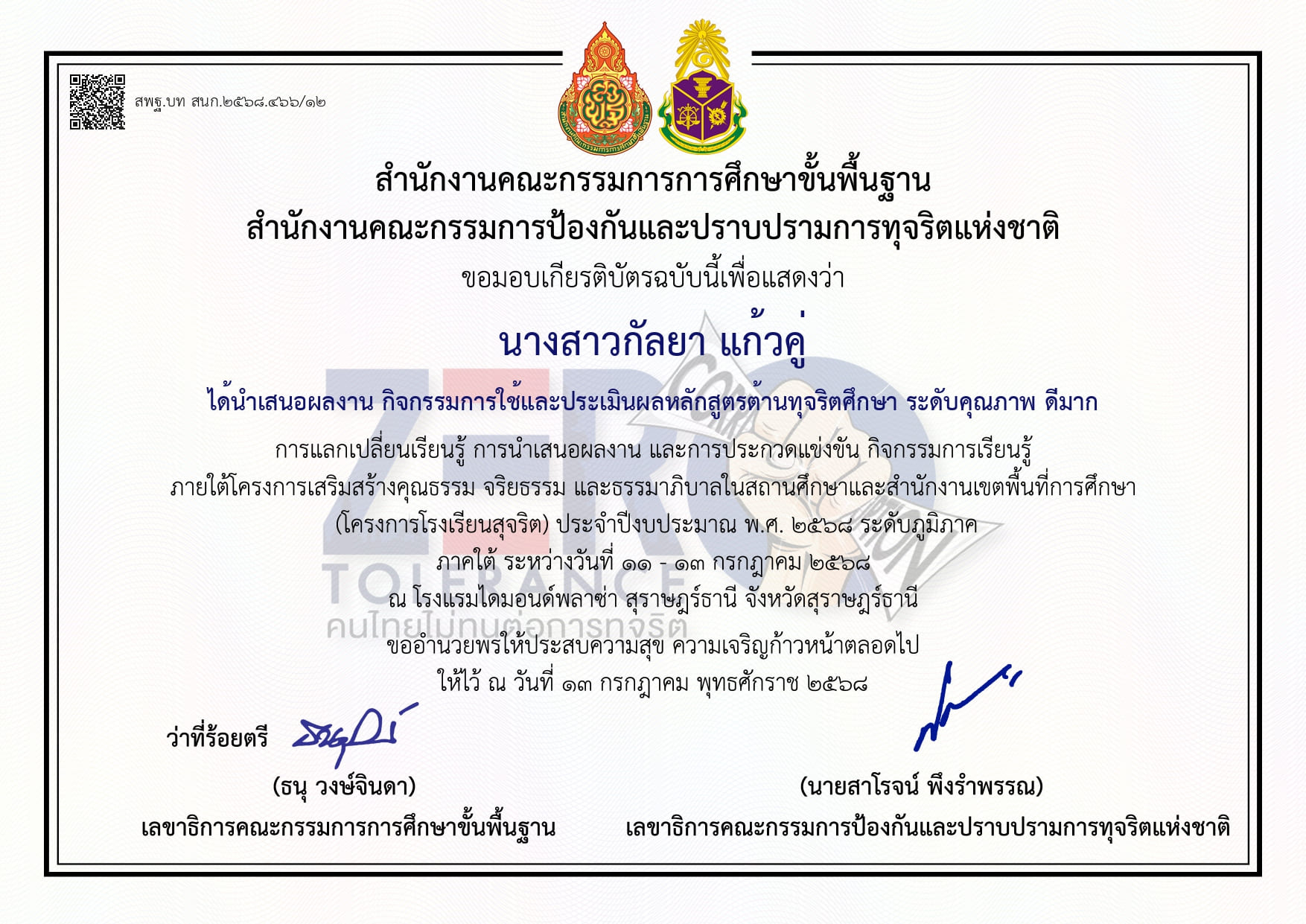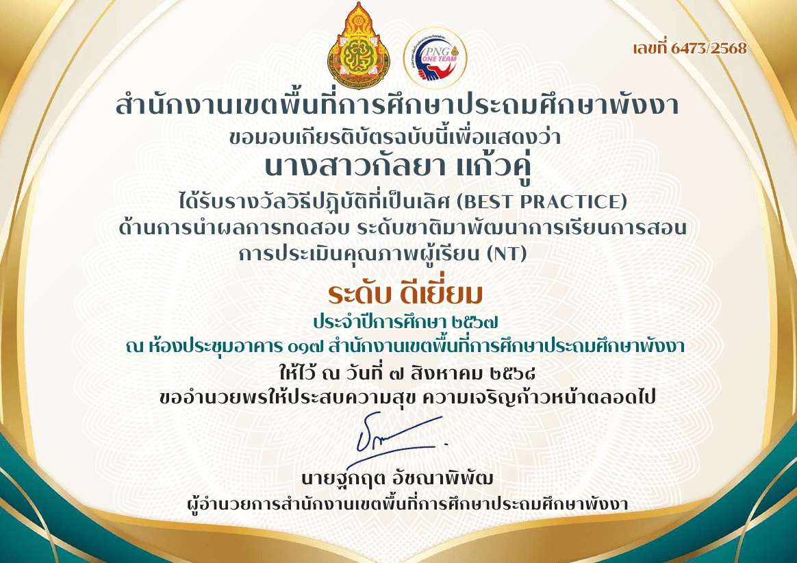 ได้รับรางวัล "ชนะเลิศ" วิธีปฏิบัติที่เป็นเลิศ (BEST PRACTICE) ด้านการนำผลการทดสอบระดับชาติมาพัฒนาการเรียนการสอน การประเมินคุณภาพผู้เรียน (NT) |