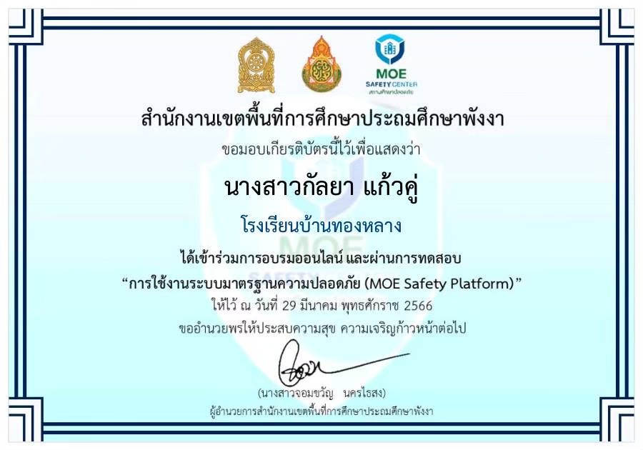 ชื่อผลงาน : ผ่านการทดสอบ "การใช้งานระบบมาตรฐานความปลอดภัย (MOE Safety Platform)"