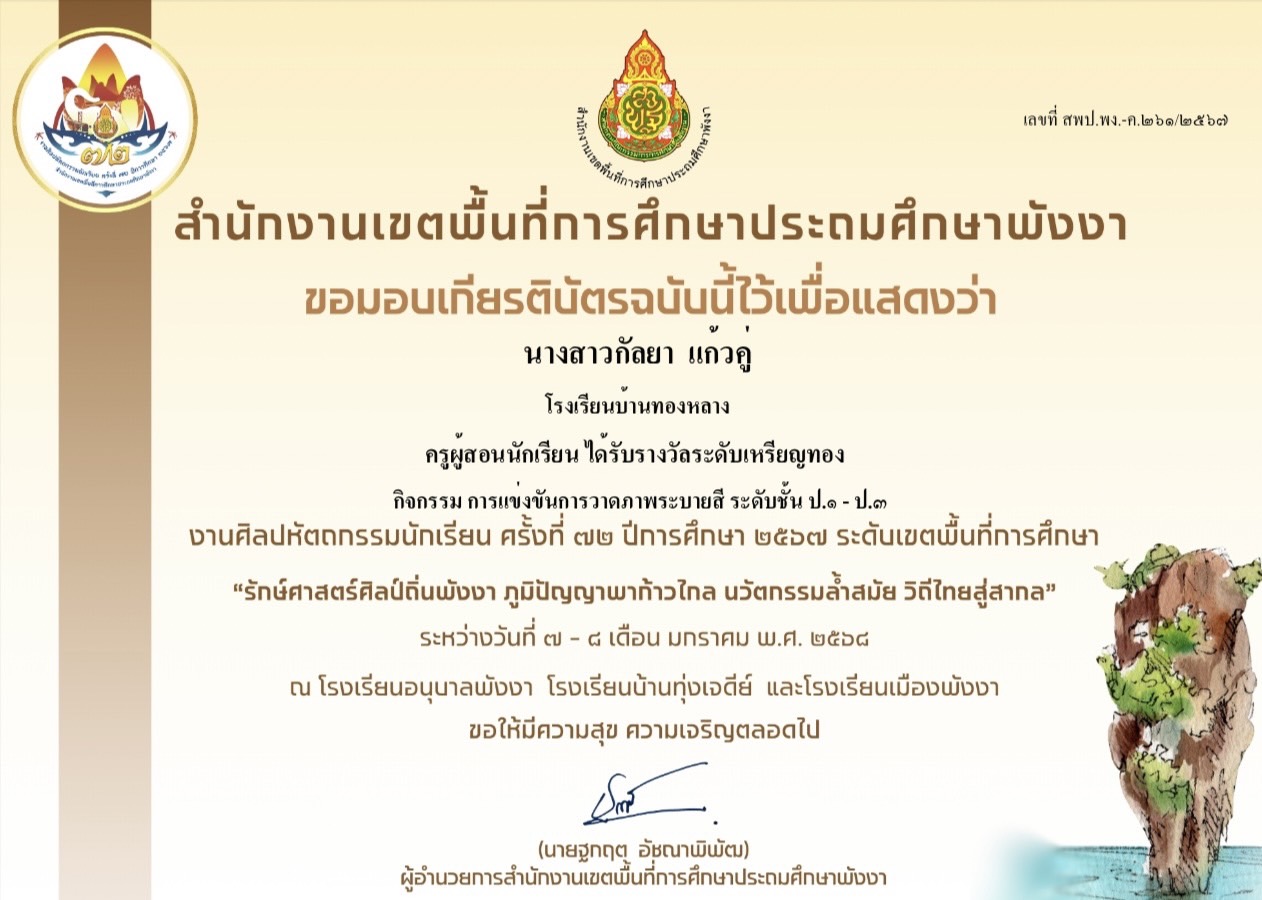 ชื่อผลงาน : ครูผู้ฝึกสอนนักเรียน ได้รับรางวัลระดับเหรียญทอง กิจกรรม การแข่งขันการวาดภาพระบายสี ระดับชั้น ป.1 - ป.3