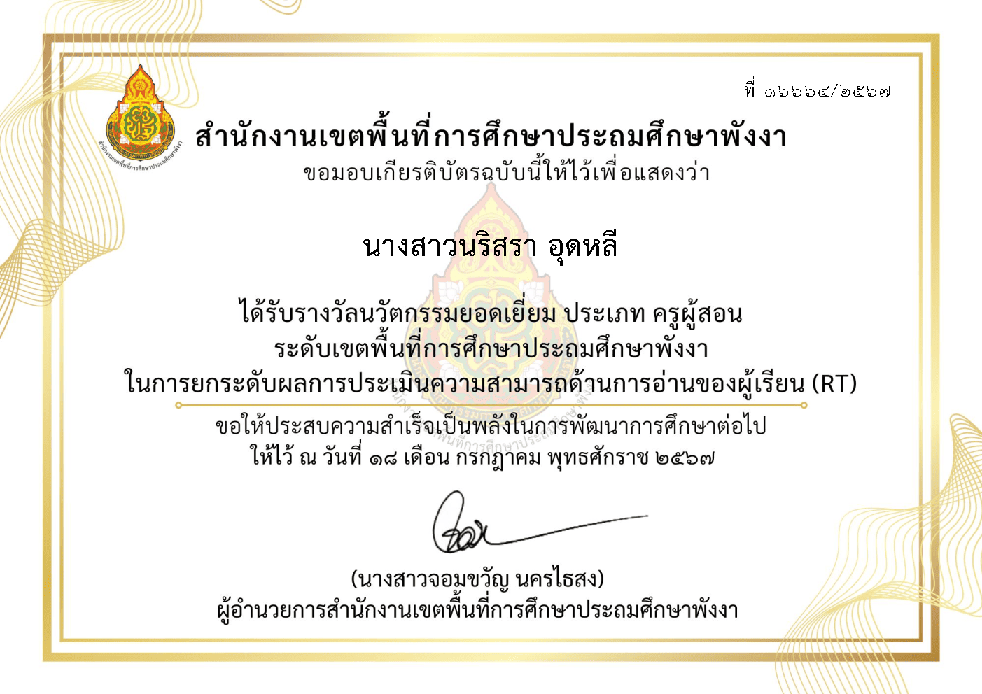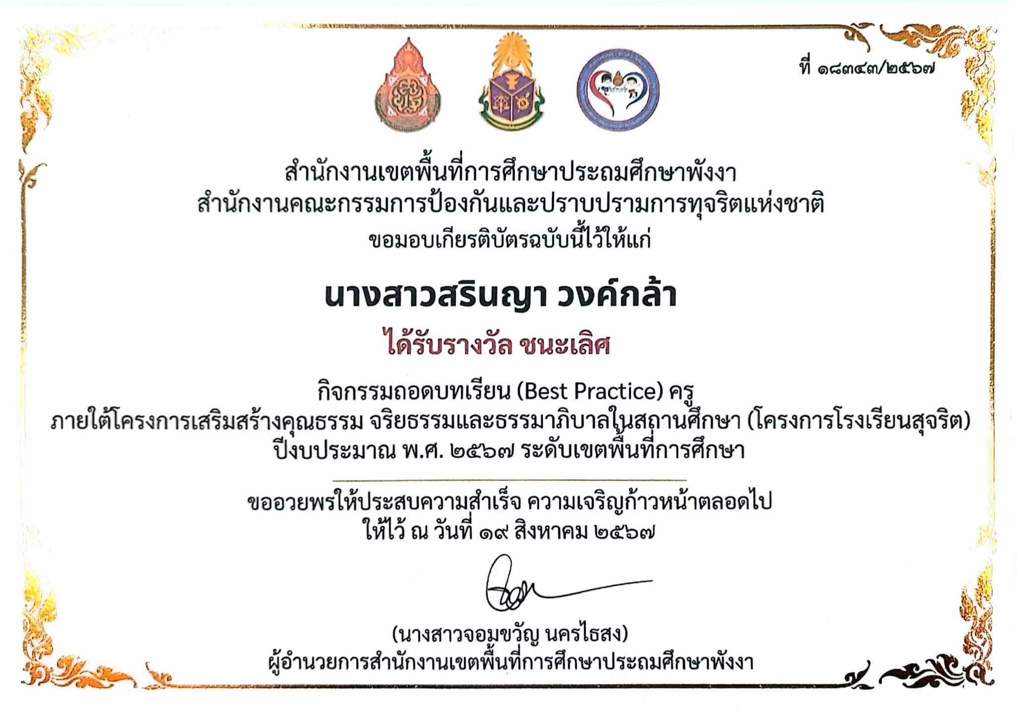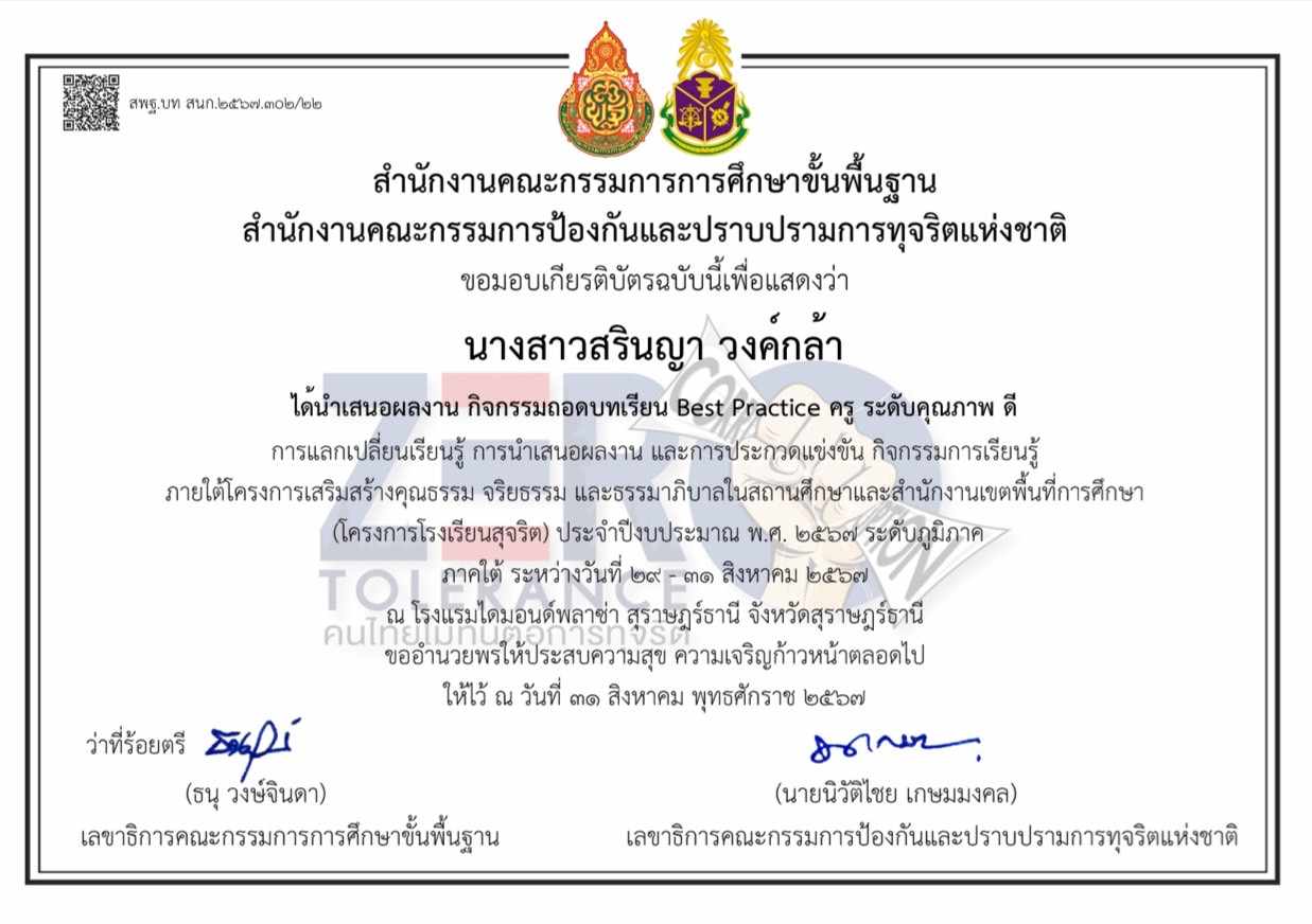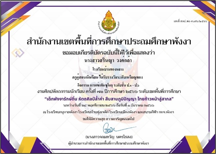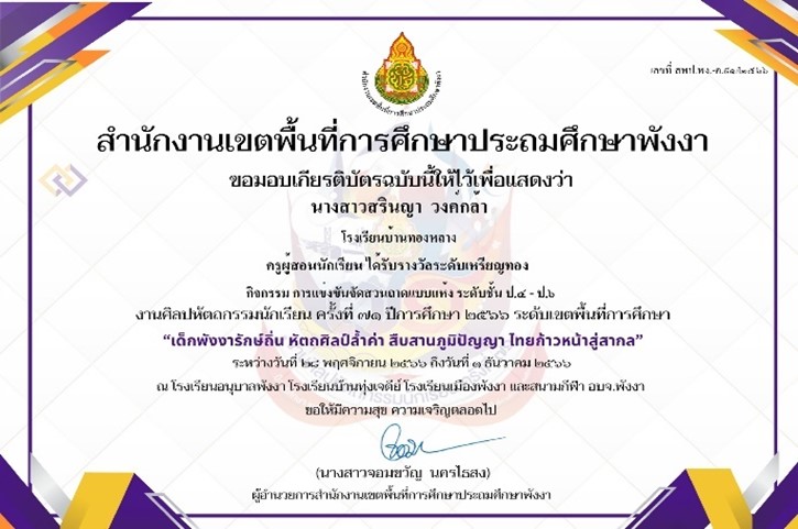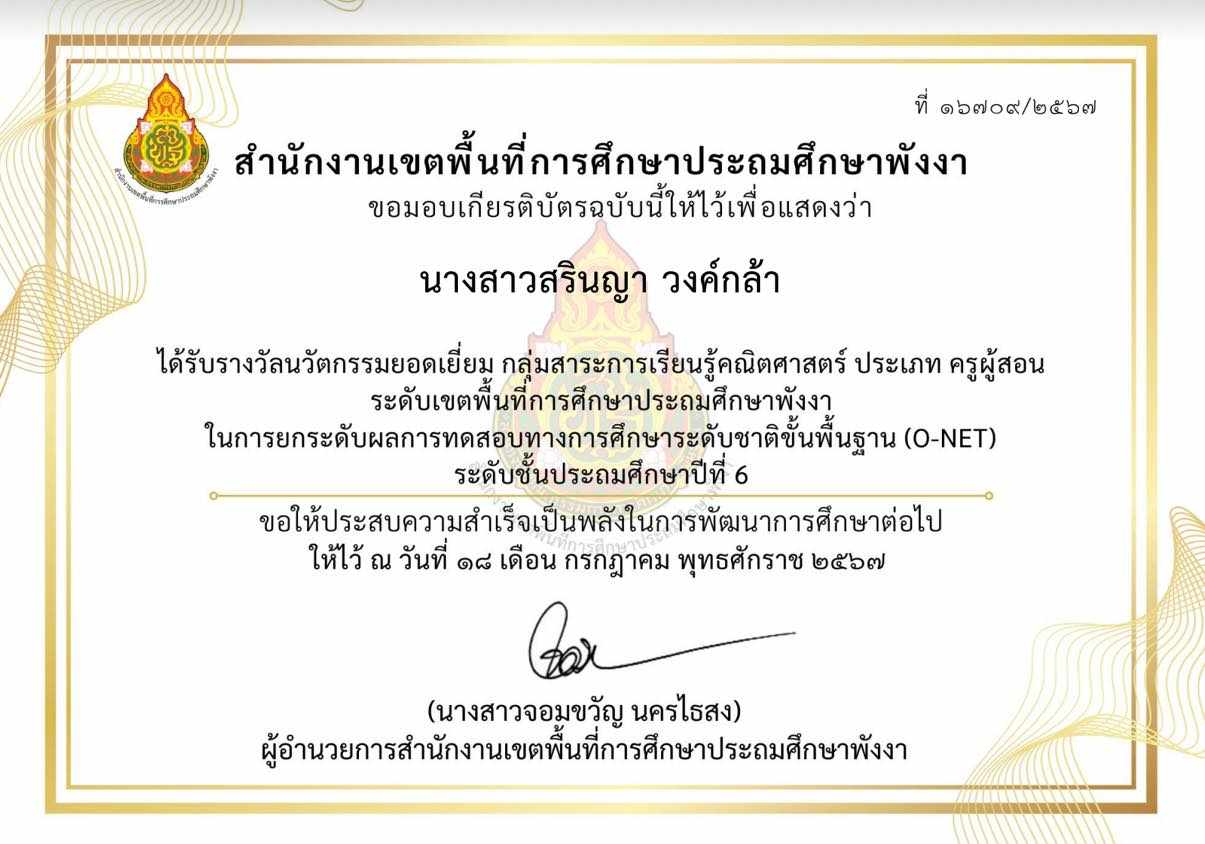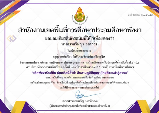 ครูผู้สอนนักเรียน ได้รับรางวัลเหรียญเงิน การประกวดโครงงานคณิตศาสตร์ ประเภทบูรณาการความรู้ในคณิตศาสตร์ ไปประยุกต์ใช้ ป.๔-ป.๖ ระดับเขตพื้นที่การศึกษาประถมศึกษาพังงา |